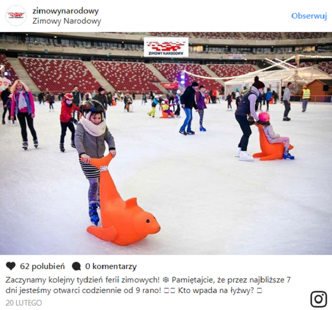 Lodowisko jest otwarte do 303 w godzinach. ZIMOWY NARODOWY lodowisko górka lodowa curling disco lodowisko skatepark bumper cars karuzela strefa gastronomiczna Zakończyliśmy 6 edycję Zimowego Narodowego.