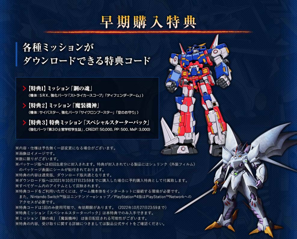 劇場版 マジンガーz infinity超電磁ロボ コンバトラーV機動戦士zガンダムコードギアス 復活のルルーシュなど様々なアニメーションに登場したロボット達が作品の垣根を越えて 一堂に会するシミュレーションrpgスーパーロボット大戦スパロボのシリーズ30周年を記念. ダウンロード版へは2021年10月27日2359までに購入した場合に予約購入特典として付属致します すべてゲーム内のアイテムとして反映されます 特典コードをご利用いただくにはゲーム機本体をインターネットに接続する環境が.