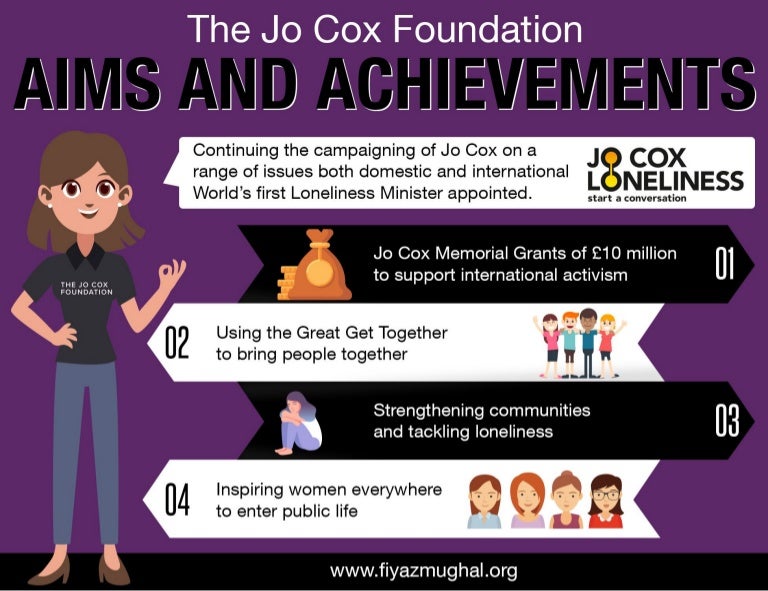 It is truly heart-warming to have something so special in her name. The appointment of the worlds first Minister for Loneliness and 20 million new funding for. In 2016 I set up the Jo Cox Foundation in memory of my friend Jo Cox MP with her family.